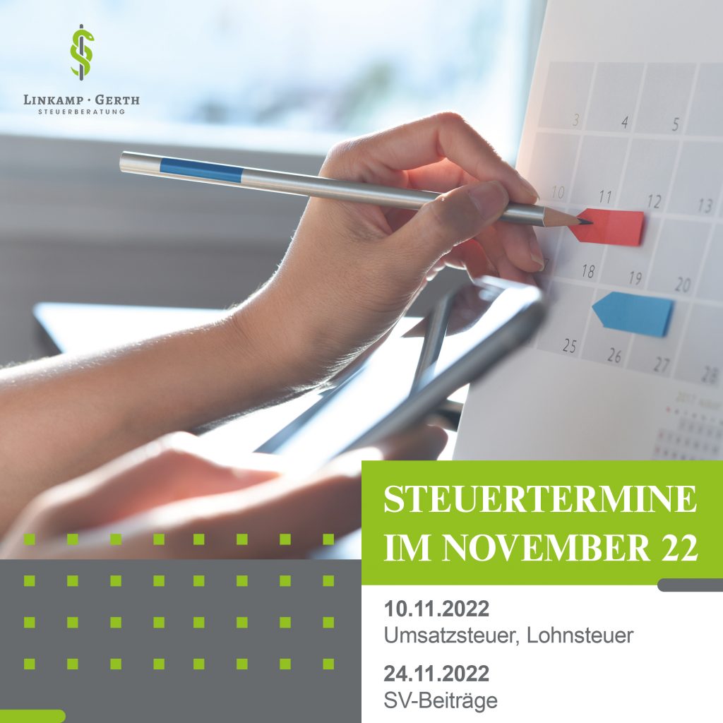 Steuertermine im November 10.11.2022 Umsatzsteuer, Lohnsteuer 24.11.2022 SV-Beiträge