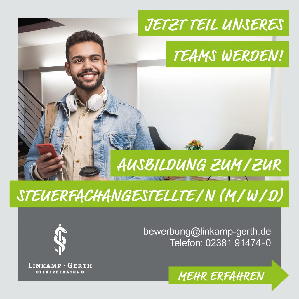 Wir suchen Verstärkung für unser Team! Für den Ausbildungsstart zum 01.08.2023 suchen wir eine/n Auszubildende/n zum/zur Steuerfachangestellte/n. Wir freuen uns von Dir zu hören oder zu lesen:02381 91474 - 0bewerbung@linkamp-gerth.dewww.linkamp-gerth.de Klicke jetzt den nachstehenden Link und erfahre noch mehr:www.linkamp-gerth.de/2023/ausbildung-zum-zur-steuerfachangestellte-n-m-w-d-in-hamm/Du möchtest mehr über die Ausbildung zum/zur Steuerfachangestellte/n erfahren? Und unser Unternehmen kennenlernen? Perfekt, dann sind unsere Infotage genau […]