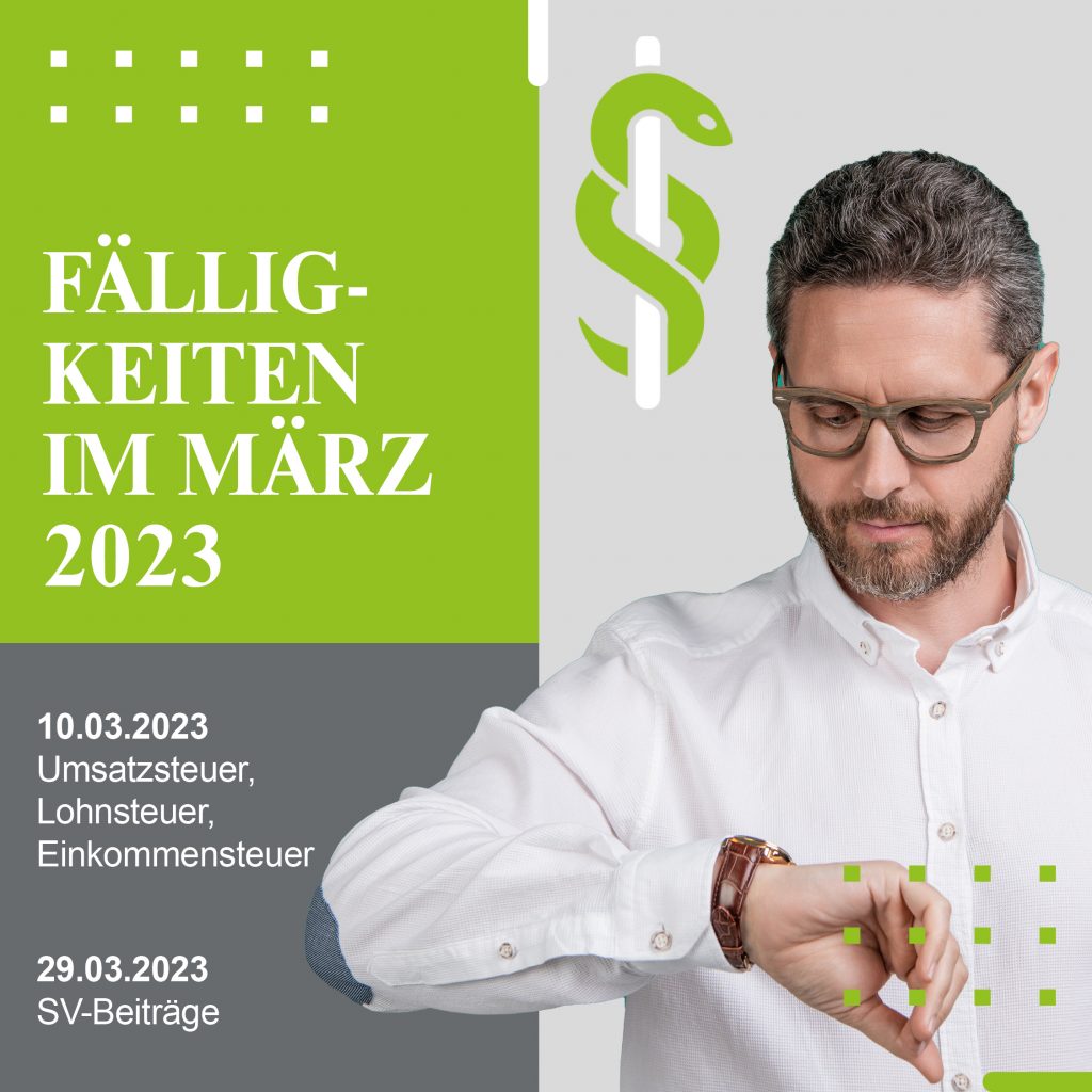 10.03.2023 Umsatzsteuer, Lohnsteuer, Einkommensteuer 29.03.2023 SV-Beiträge