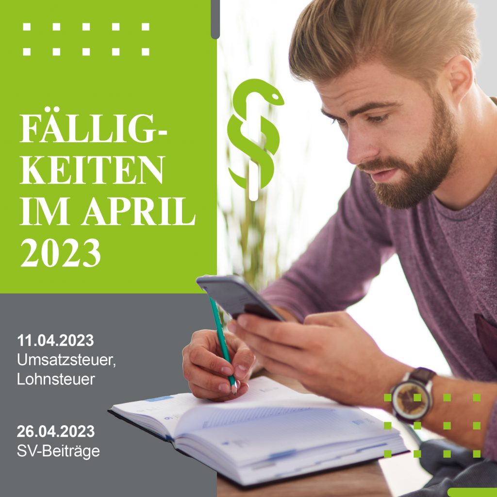 11.04.2023 Umsatzsteuer, Lohnsteuer 26.04.2023 SV-Beiträge