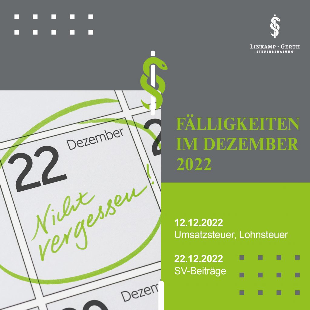 Steuertermine im Dezember 2022 12.12.2022 Umsatzsteuer, Lohnsteuer 22.12.2022 SV-Beiträge